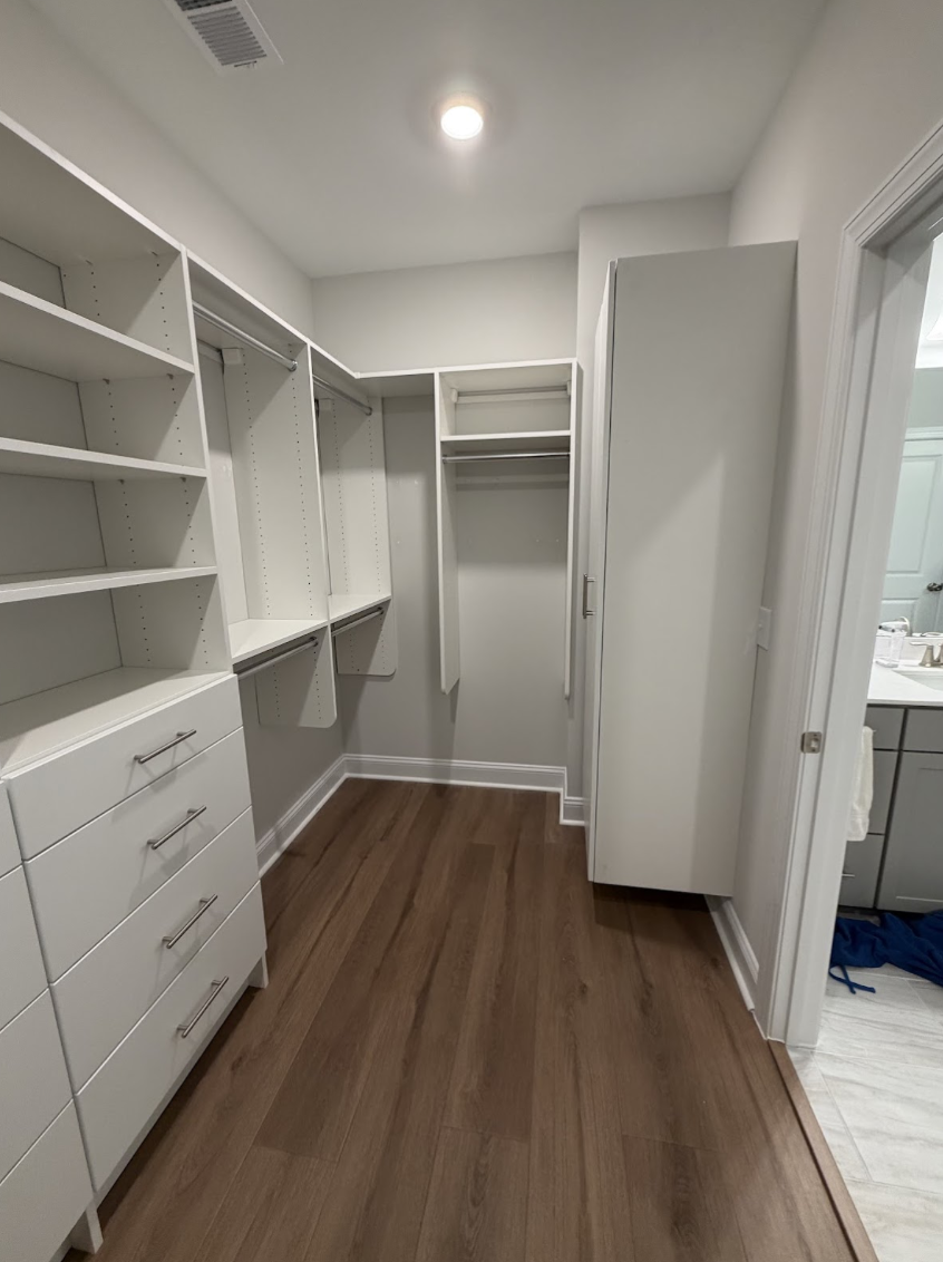 We removed the outdated wire racks and replaced them with a custom closet storage system designed to improve organization and accessibility. The new setup offers dedicated space for clothing, accessories, and everyday essentials—making everything easier to see and reach. The result is a polished, built-in feel that dramatically improves both storage capacity and daily functionality in this Durham, NC home.