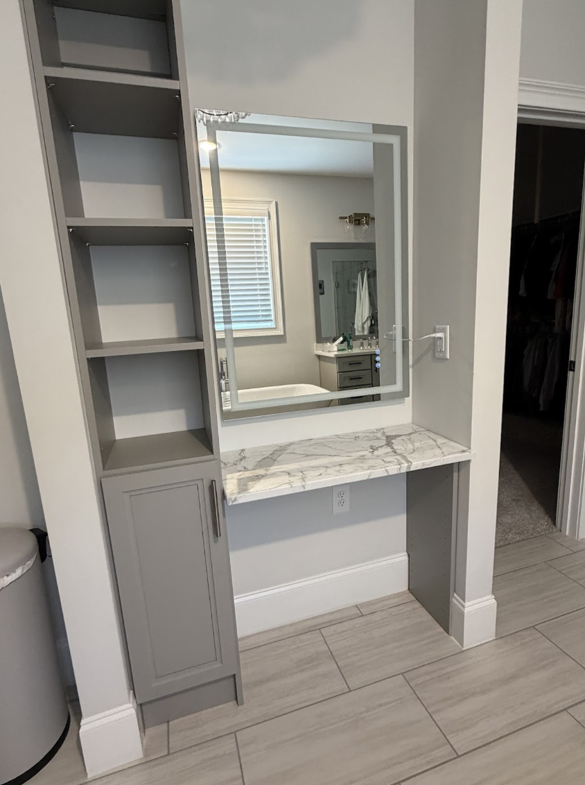 We designed and installed custom shelving to keep laundry essentials neatly arranged and easy to access. In the vanity area, tailored storage and a mirror element brought both function and style together, helping create a space that feels intentional and clutter-free. The result is a practical yet refined storage upgrade that makes daily routines smoother and more enjoyable in this Apex, NC home.