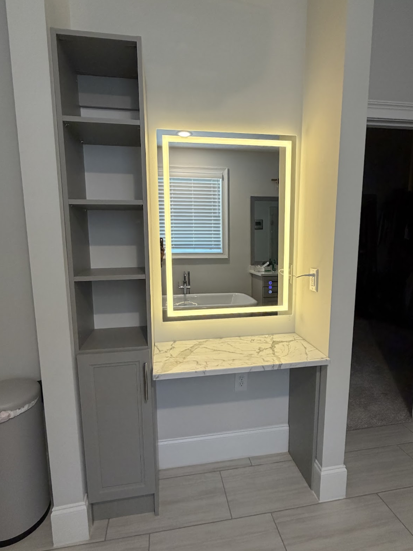 A custom storage solution in Apex, NC designed to organize a laundry area and vanity space with tailored shelving and built-in features.