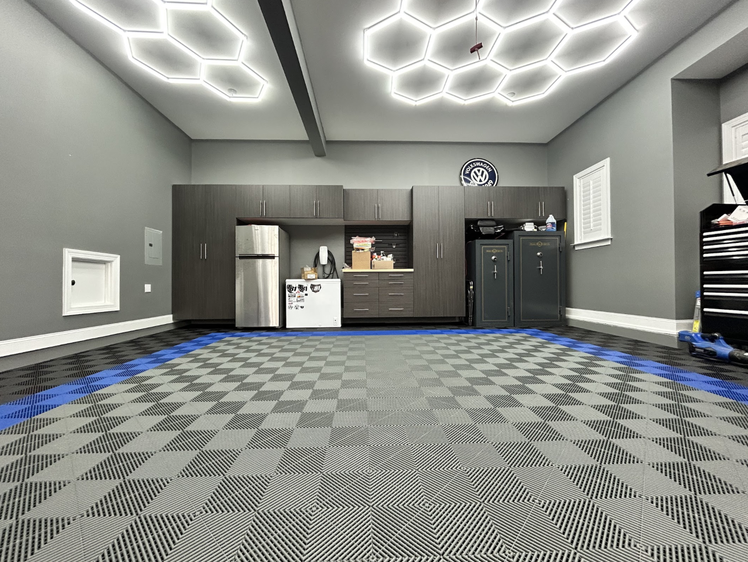 A complete garage and mudroom upgrade in Pittsboro, NC featuring Swisstrax flooring, custom cabinets, and tailored closet storage.