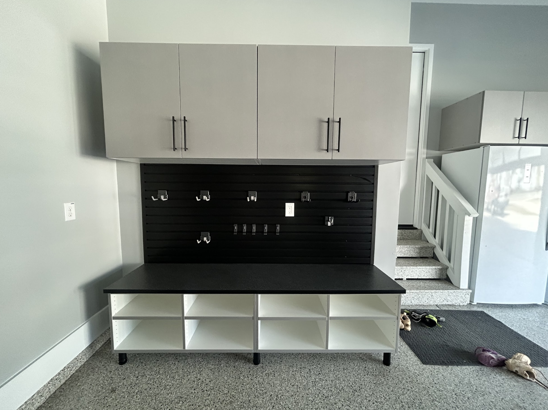 A full garage remodel featuring hidden storage, a seating area, and easy-access organization for everyday use.