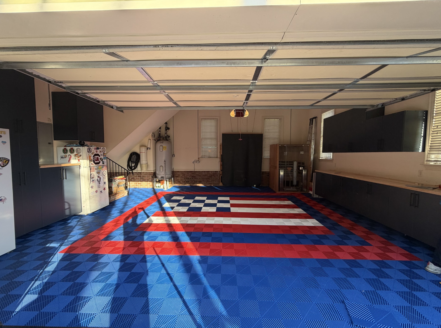 A garage storage upgrade in Summerfield, NC featuring custom cabinets and Swisstrax flooring for a clean, durable finish.