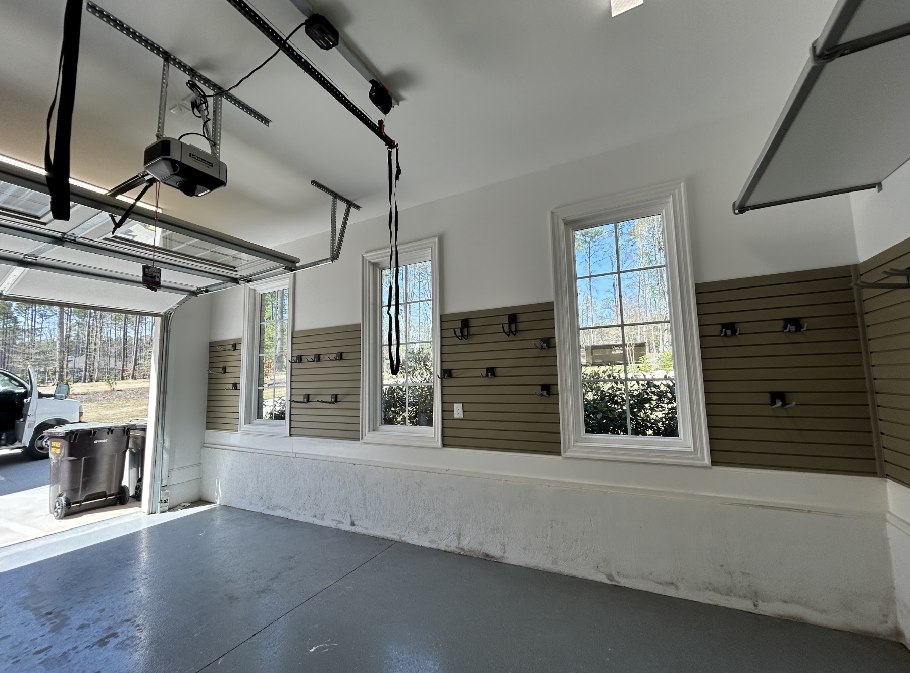 A total garage transformation in Greensboro! New cabinets, slatwall, epoxy flooring, and motorized bike lifts turned this space into a clean, organized dream garage.